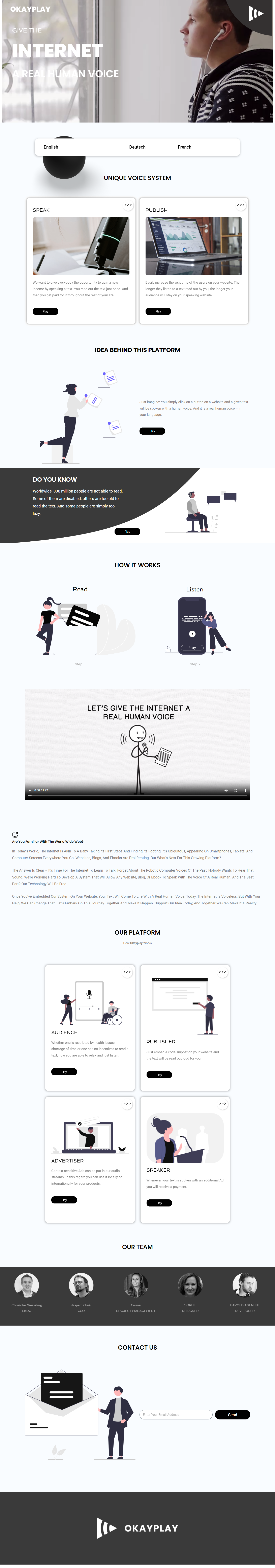 The goal in establishing OkayPlay was to create a marketplace that seamlessly connects voice artists with clients seeking premium voice recordings. We aimed to offer a wide array of vocal content for diverse applications, from marketing to entertainment, in a user-friendly and accessible environment. Our vision is to empower both voice artists and clients by providing a platform that fosters collaboration, creativity, and efficiency. OkayPlay aspires to be the ultimate destination for all things related to exceptional voice recordings.